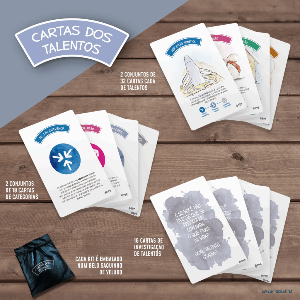 * Inclui KIT das Cartas dos Talentos: 2 conjuntos de 32 cartas de talentos + 2 conjuntos 10 cartas de categorias + 16 cartas de investigação de talentos